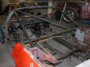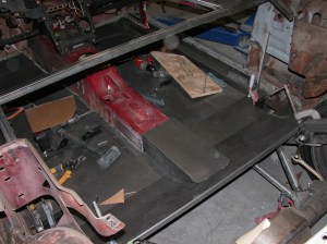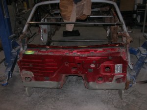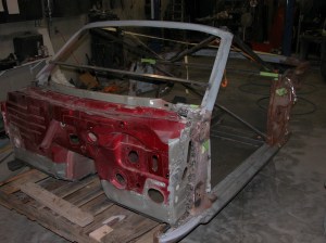 Once the basic dimensions were verified, the trimming and fitting began to integrate the new and old together into one. The end result was a “tub” that was made from the 67 windshield pillar supports and frame, the outer rockers, and rear quarter supports connected together via the ’06 firewall, tunnel and a fabricated floor section. The tub was designed to be the central core of the car and designed to bolt directly to the chassis to form the equivalent of the original 1967 uni-body structure only much more rigid and stronger. Once the initial tub fabrication was completed we loaded it up and off it went to the media blaster to clean it up so that we had a nice consistent base to work from.