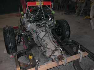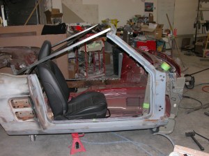 Considerable effort went into the seemingly simple task of determining engine placement…too low and we wouldn’t have sufficient clearance…too high and there isn’t sufficient hood clearance…too far back and it encroaches into the cockpit space, etc., etc…This critical process was the first step in establishing proof of concept for what we were trying to accomplish. The next step was to start the trial fitting of firewall and tunnel structure from the donor car. Critical interior pieces such as the dash, console, and seats were placed to insure that cockpit dimensions would be correct. Front fenders were hung to verify engine location and establish the basic requirements and location for the radiator core support and inner engine compartment fenders.