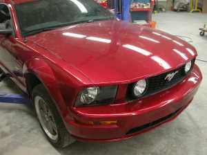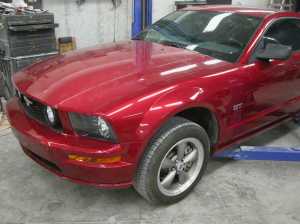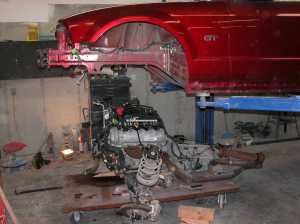 We had previously decided to install a modern era engine as Isadora’s power plant. Perusing information from various engine builders and the Ford Racing Parts catalogue drove us to the conclusion that, for Isadorda, the 4.6 L, 3-valve engine that was the mainstay in the 2005-2009 Mustang series would be an ideal engine; not too “hopped up” but powerful enough that this would be a fun car to drive. We were about to place an order when Scott came up with another idea that ultimately changed the entire direction of the build. He suggested that rather than buying a new engine we should consider the possibility of acquiring a wrecked Mustang and stripping the needed components out of it. So, with a little research we soon found a very low-mileage 2006 GT that had been rear ended and declared “totaled” by the insurance company but was still capable of driving on and off a transporter. Including shipping, the price for the entire car was less than that of a new crate engine not even including the additional required computer systems. Additionally, to reduce the overall project costs we could strip whatever parts we didn’t need and sell them or trade for services that might be required during the build. We confirmed the order with the salvage yard and waited for the transporter to arrive.