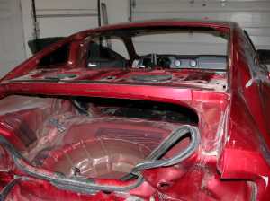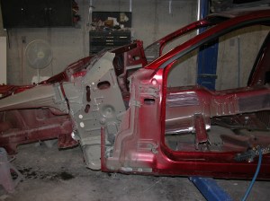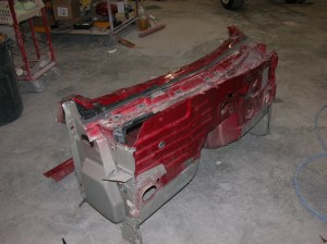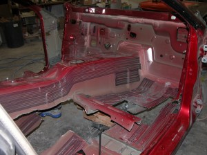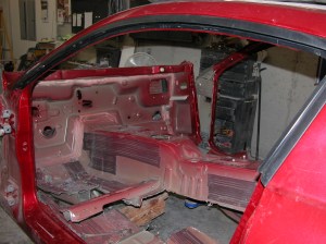Because the donor car had been rear-ended and was very lightly damaged except for some crumpled rear frame rails, it was about this time that we started asking “What if” questions about the donor car…”What if we could use more than just the engine and transmission?”…”What if we could use the entire interior?”…”What if we could use the entire dash board including instrumentation and other systems including heat and AC?”…”What if we could use the entire computer system?”…With all of these possibilities the final plan began to be formulated. We determined that if we could use the firewall and transmission tunnel from the donor car that perhaps all of the other systems could be used as well. Out came the plasma torch and Scott went to town on the donor reducing it to a pile of scrap!
